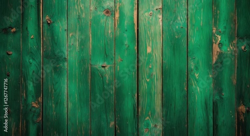© GenZGraphics, Fototapeta premium Green textured wooden background with knots and scratches providing a rustic look, suitable for various design applications. Copy Space.