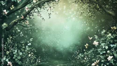 © Joyce, Fototapeta premium Green theme Spring background with flowers leaves.