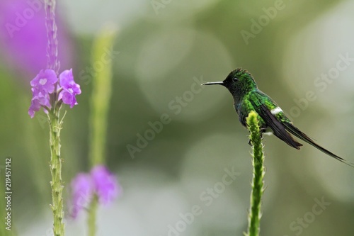 Fototapeta premium Green Thorntail, sitting on flower in garden, bird from mountain tropical...