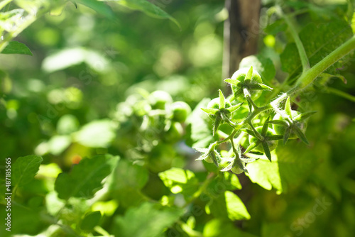 © Shi , Obraz premium Green tomato plant growing in organic vegatable garden, close-up