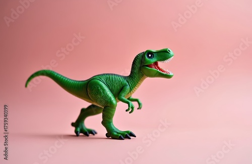 © Maryna, Fototapeta premium Green toy dinosaur stands on pastel pink background. This model has open mouth red tongue and white teeth. Plastic dino is a children toy or decoration.