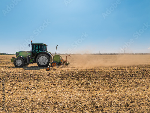 © glebzter, Fototapeta premium Green tractor plowing dry field on a sunny day, raising dust