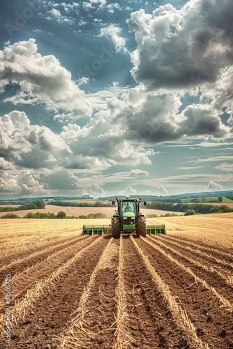 © Alexander LW, Fototapeta premium green tractor plows grain fields with sky with clouds