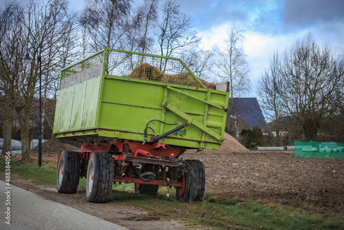 © karegg, Obraz premium green tractor trailer stands on the roadside next to a field.