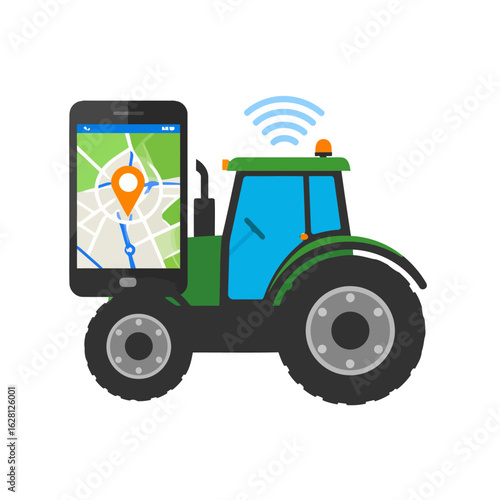 Fototapeta premium Green Tractor with Smartphone Displaying GPS Location and Wireless Signal