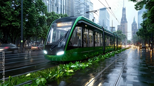 © Surachate, Fototapeta premium Green Tram on Rainy Street with Modern Cityscape and Trees