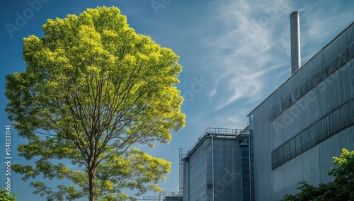 Fototapeta premium Green Tree Against a Factory Building