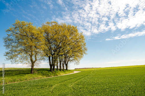 © EwaStudio, Obraz premium Green tree and green grass on slope with white clouds and blue sky.