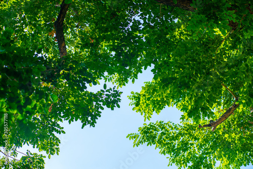 © themorningglory, Obraz premium Green tree flora leaf of Burma Padauk against sun light