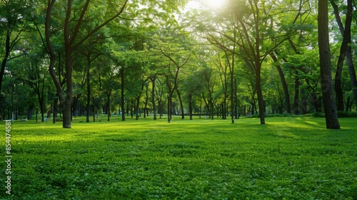 © Syahrul Zidane A, Fototapeta premium Green tree forest in city public park with green meadow grass nature landscape