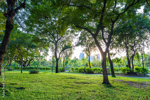 © themorningglory, Obraz premium Green tree forest meadow green graas in city public park sunset light sky