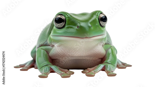 Obraz premium Green tree frog close-up on a dark background, facing forward