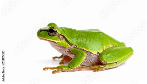 © Irfan, Naklejka premium Green tree frog in profile view on white background, showing climbing features