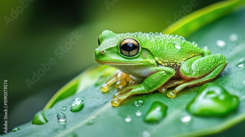 © brayen, Obraz premium Green Tree Frog on a Leaf