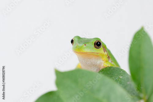 © littlepearlstock, Obraz premium Green Tree Frog on Leaf, White Background