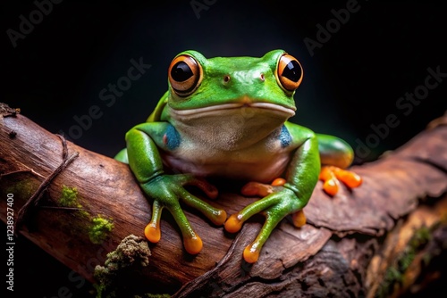 © Danicha, Fototapeta premium Green Tree Frog Perched on Branch in Night Forest