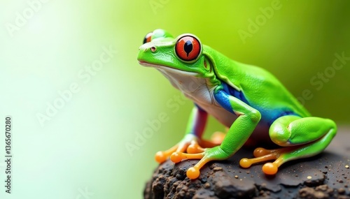 Naklejka premium Green tree frog perched on white background, vibrant colors , green, green...