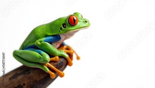 © Chanchai, Naklejka premium Green tree frog perched on white, vibrant color , isolated, copy space