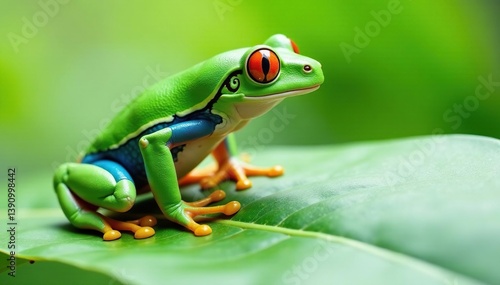 © StepRunnerIO, Naklejka premium Green tree frog perched on white, vibrant colors, reptile, tree frog