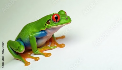 Fototapeta premium Green tree frog perched on white, vibrant skin, amphibian, fauna