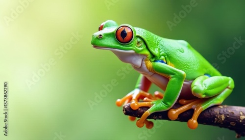 Obraz premium Green tree frog perched on white, vibrant skin, detail, studio shot