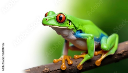 © Anulak, Obraz premium Green tree frog perched on white, vibrant skin, isolated , white background, tropical, one