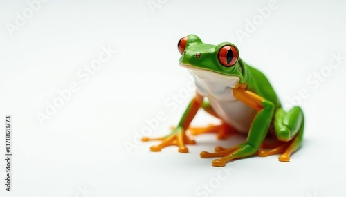 Naklejka premium Green tree frog perched on white, vibrant skin, macro photography, white