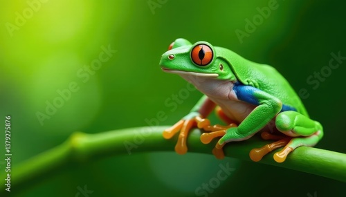 © Phetthanousack, Obraz premium Green tree frog perched on white, vibrant skin, studio shot, green frog, isolated