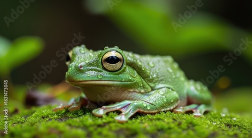 © Rizqiana, Fototapeta premium Green tree frog sits on mossy surface, speckled with droplets, eye-catching