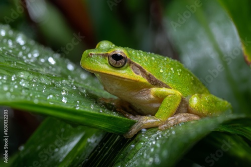 © Vishwesh, Naklejka premium Green tree frog sitting on a leaf with water droplets nature amphibian wildlife macro photo