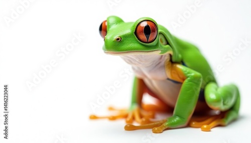 Fototapeta premium Green tree frog, vibrant skin, white background, studio shot, white...