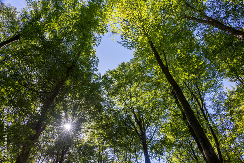 © abasler, Fototapeta premium Green tree from below against blue sky as background
