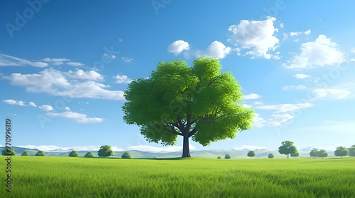 Obraz premium Green tree on the meadow and blue sky. 3d render