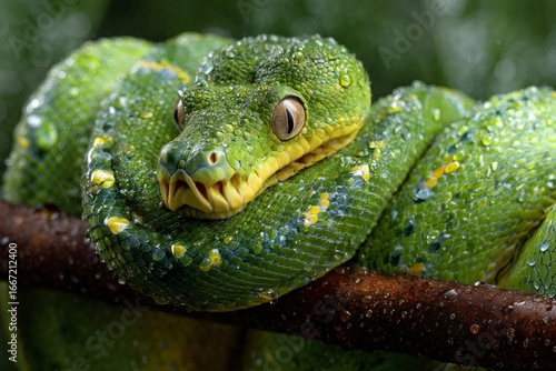 © Lubos Chlubny, Fototapeta premium Green tree python resting on a branch after the rain