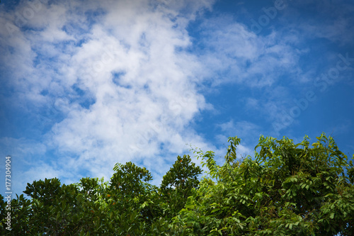 © thechatat, Fototapeta premium Green tree top line over blue sky and clouds background in summer
