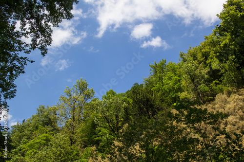 © dashtik, Fototapeta premium Green tree top over blue sky and clouds background in summer