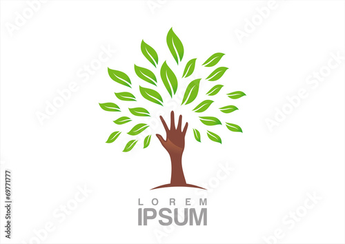 Fototapeta premium Green tree with hands-shaped trunk and many ecological icons