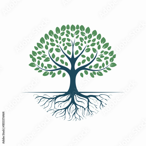 Fototapeta premium Green tree with sprawling roots, symbolizing growth, life, and stability
