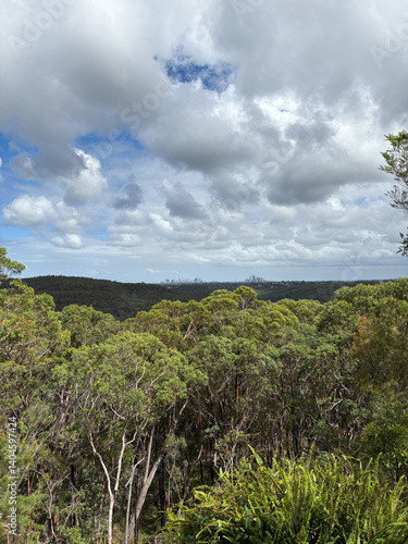 © AlexandraDaryl, Obraz premium Green trees and blue sky with city skyline on the background.