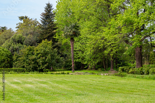Obraz premium Green trees and green grass in a spring park on a sunny day