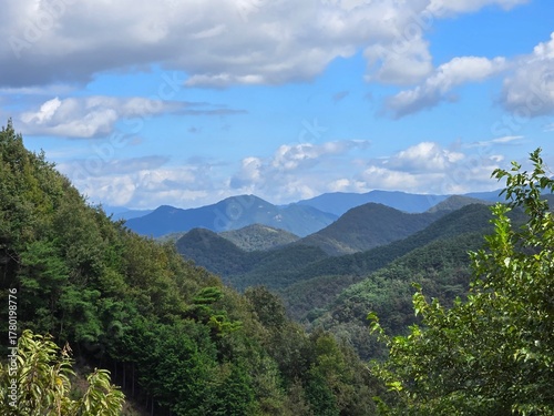© blue wind, Fototapeta premium Green trees and leaves, forested mountains and rivers, cloudy sky, sunrise, sunset