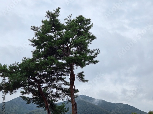 Obraz premium Green trees and leaves, forested mountains and rivers, cloudy sky, sunrise,...