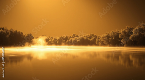 © Chanasorn, Fototapeta premium "Green trees and soft golden sunlight on a tranquil lake at sunrise, creating a serene wallpaper atmosphere."