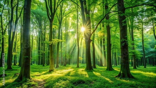 Naklejka premium Green trees casting dappled light in serene forest setting, nature,...