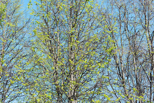 Fototapeta premium Green trees crowns on the blue sky background,.