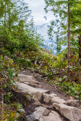 © Harrison, Fototapeta premium Green trees in a forest surround dirt hiking trails in the Pacific Northwest