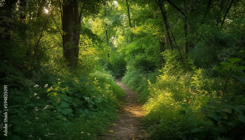 Fototapeta premium Green trees line footpath in tranquil nature generated by AI