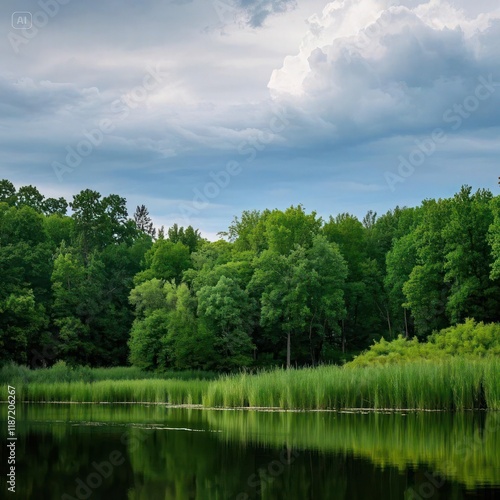 © Hameeda, Fototapeta premium Green trees near lake under cloudy sky during daytime