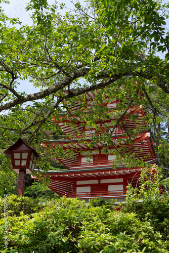 © Em Neems Photography, Fototapeta premium Green trees red Japanese temple