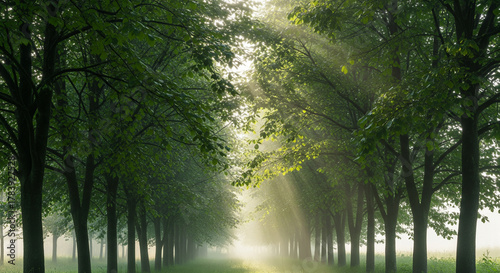 Obraz premium green trees with morning sunlight penetrating beautifully
